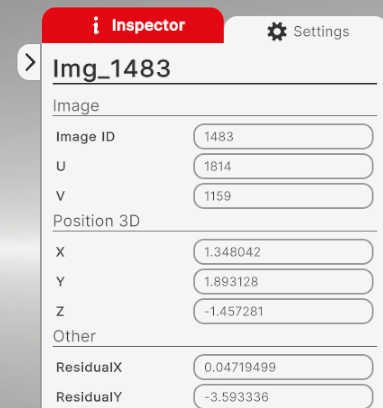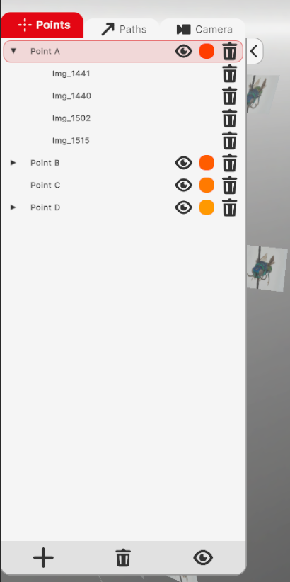 You can create a point by clicking the “+” icon on the left panel. A point consists of multiple 2D points in different images, forming the final precise point. To add a 2D point, click on a preview image and right-click on the image. Your point will be added to the selected point in the treeview. When a point is placed on a preview image, the selected preview turns green, indicating that a point has been made using this image. If at least two points are placed in different preview, a precise 3D point is created through triangulation. Additional points can be added by clicking the plus icon in the left interface. You can click on a point in the tree to select it, and any new points added in the preview will be used for triangulation. You can rename a point by double-clicking on its name. Next to the point’s name, there are three icons: an eye to show or hide the point, a square to change the point’s color, and a trashcan to remove the point. At the bottom, similar icons are available to show or hide all points and to remove all points.